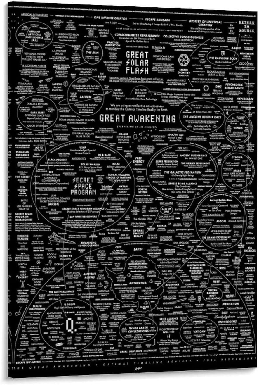 This stunning Great Awakening Map canvas print invites you on a visual journey through the mysteries of the universe, ancient civilizations, and the awakening of consciousness.The design features intricate details, connecting cosmic events, spiritual philosophies, and historical figures to create a powerful visual statement. This poster is perfect for those who seek to deepen their spiritual journey, explore cosmic knowledge, or add a meaningful piece of art to their home or office. With its rich, thought-provoking design, this print is sure to spark conversation and inspire reflection in any space.